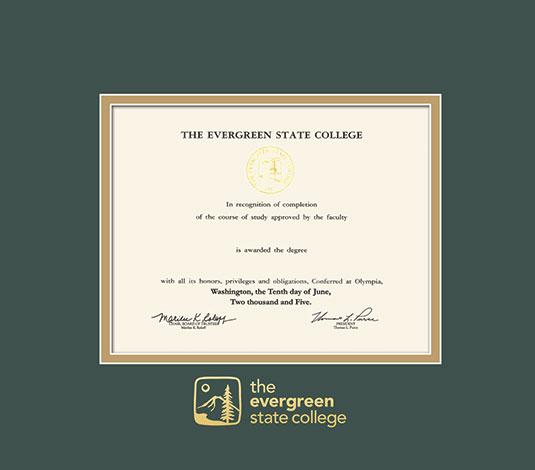 Evergreen State College Diploma Frame with Green and Gold Double Mat and Gold Embossing