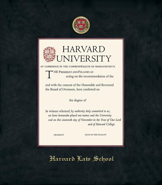 Harvard University Diploma - Law Frame with Black Suede and Wood Fillet Double Mat and Colored Medallion