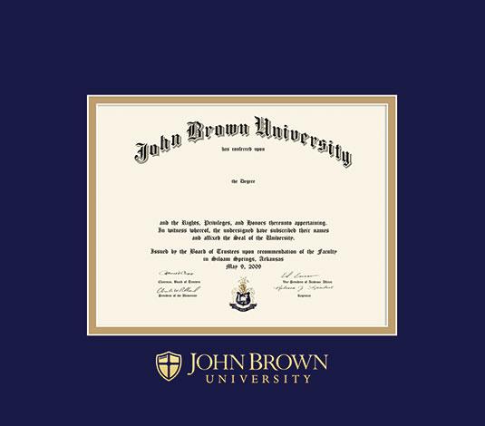 John Brown University Diploma (6/25 to Present) Frame with Navy Blue and Gold Double Mat and Gold Embossing
