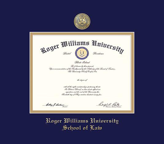 Roger Williams University Diploma - Law Frame with Medallion and Navy Blue and Gold Double Mat and Gold Embossing