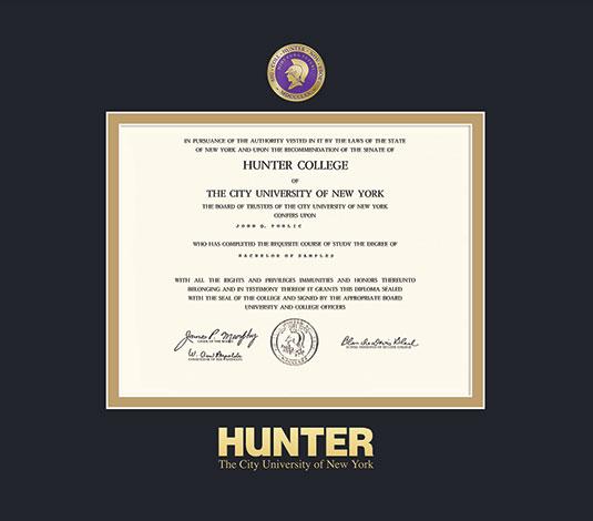 Hunter College Diploma Frame with Medallion and Black and Gold Double Mat and Gold Embossing
