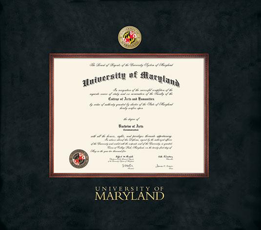 University of Maryland Diploma Frame with Medallion and Black Suede and Wood Fillet Double Mat and Gold Embossing