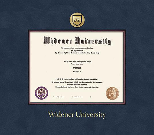 Widener University Diploma Frame with Medallion and Navy Blue Suede and Wood Fillet Double Mat and Gold Embossing