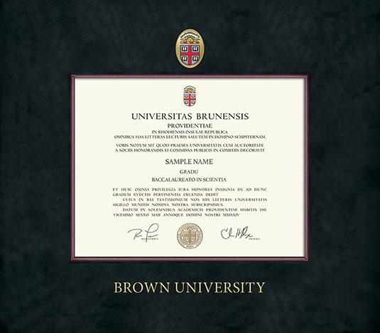 Brown University Diploma Frame with Colored Medallion and Black Suede and Wood Fillet Double Mat and Gold Embossing