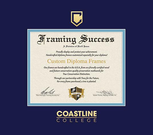 Coastline College Diploma (2026 to Present) Frame with Navy Blue and Light Blue Double Mat and Gold Embossing