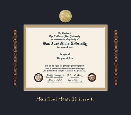 San Jose State University Diploma with Kente Ribbon Frame with Medallion and Black and Gold Double Mat and Gold Embossing
