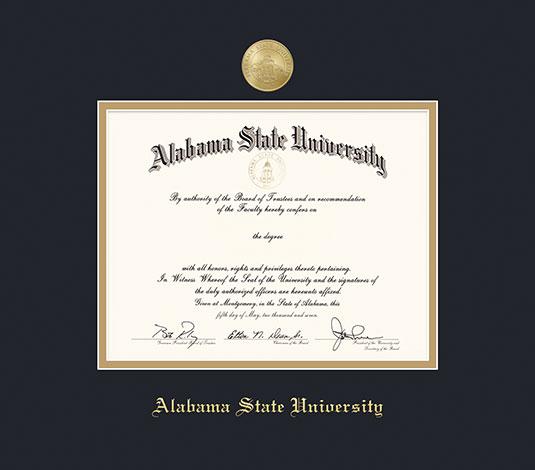 Alabama State University Diploma with Medallion Frame, Featuring a Black and Gold Double Mat with Gold Embossing