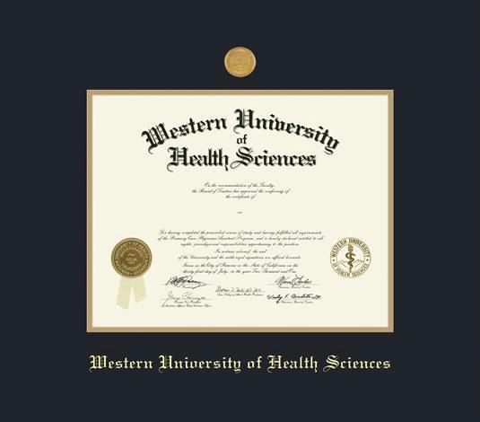Western University of Health Sciences Certificate - 8.5x11 with Medallion Frame Featuring a Black and Gold Double Mat with Gold Embossing