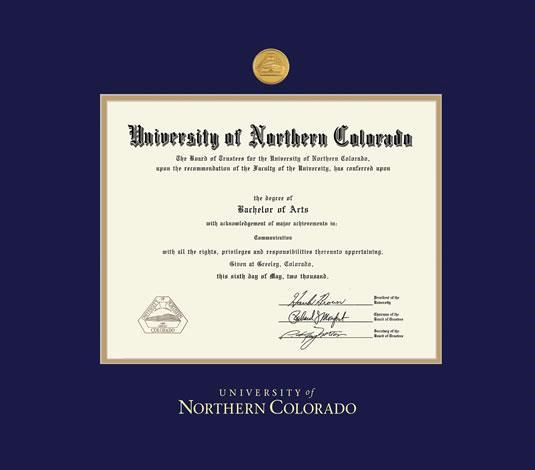 University of Northern Colorado Diploma Frame with Medallion and Navy Blue and Gold Double Mat and Gold Embossing