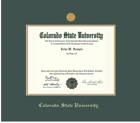 Colorado State University Diploma - BA (10/10 to Present)/MA/PhD Frame with Medallion and Green and Gold Double Mat and Gold Embossing