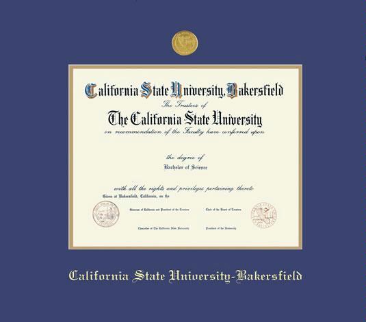 California State University - Bakersfield Diploma (7/05 to 7/22) Frame with Medallion and Royal Blue and Gold Double Mat and Gold Embossing