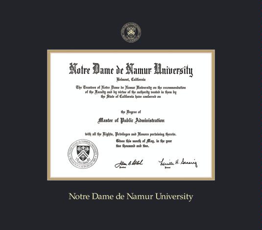 Notre Dame de Namur University Diploma (8/16 to Present) and (12/01 to 12/14) Frame with Black and Gold Double Mat and Gold Embossing