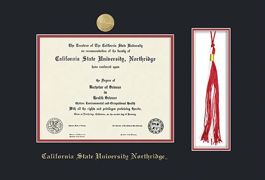 California State University Northridge Diploma Frame with Tassel Cut-out and Medallion and Black and Red Double Mat and Gold Embossing