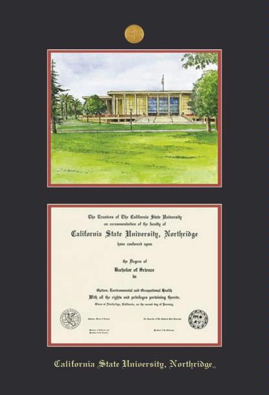 California State University Northridge Diploma and Litho Frame with Medallion and Black and Red Double Mat and Gold Embossing