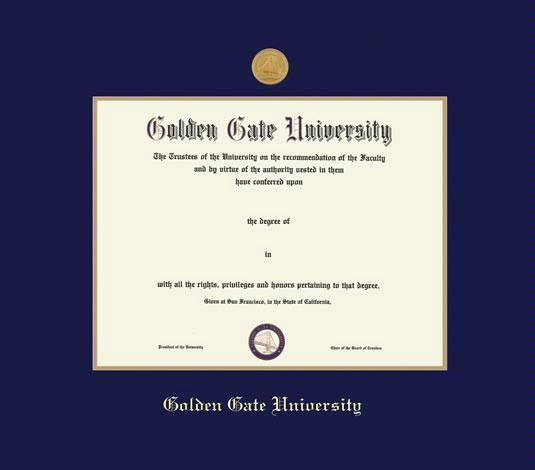 Golden Gate University Diploma - BA/MA/PhD/Business (8/02 to Present) with Medallion Frame Featuring a Navy Blue and Gold Double Mat with Gold Embossing