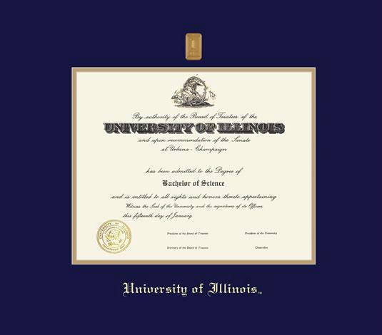 University of Illinois - Champaign Diploma (Pre 2019) Frame with Column I Medallion, Navy Blue and Gold Double Mat, and Gold Embossing