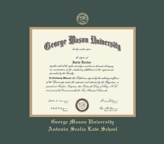 George Mason University Diploma - Law (2018 to Present) Frame with Green and Gold Double Mat and Gold Embossing