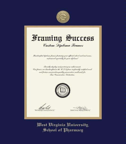 West Virginia University- Downtown Campus Diploma - Pharmacy (6/19 to Present) Frame with Medallion and Navy Blue and Gold Double Mat and Gold Embossing